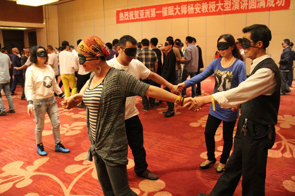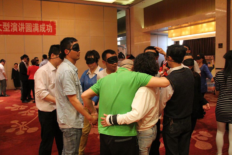 接下来,全部学员都带上眼罩,伸手不见五指,彼此之间只能通过肢体以及拥抱等形式寻找自己同组的学员。寻找到的同组学员就相互拉在一起,聚在一起。
