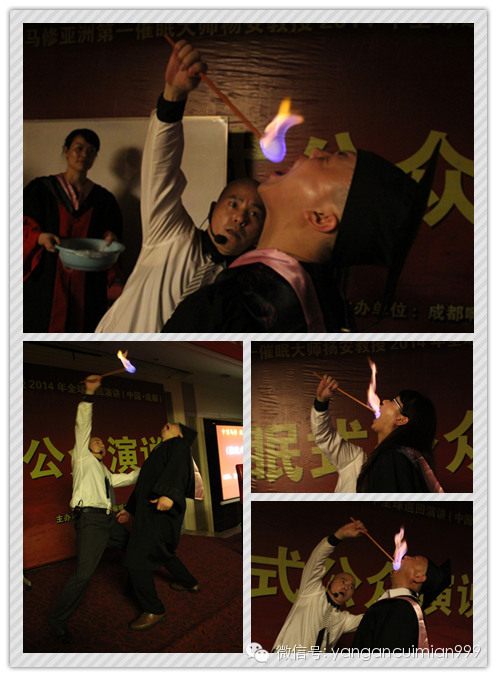 惊险的“吞火者”表演可以说是四天课程的“精彩好戏”。原来,亚洲第一催眠大师杨安教授出其不意地在台上表演起了吞火,众人惊讶声和掌声连连。表演归表演,中国马修杨安教授说每个人都可以成为勇者,所以给每人发了一根“吞火棒”。当小球被点燃,吸气、仰头、张口、放火棒入口、闭嘴,再大喊“POWER”吐出口中的烟气。如此反复练习了几次,大家信心满满,都积极地排队上台充当“吞火者”。