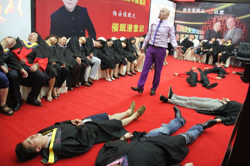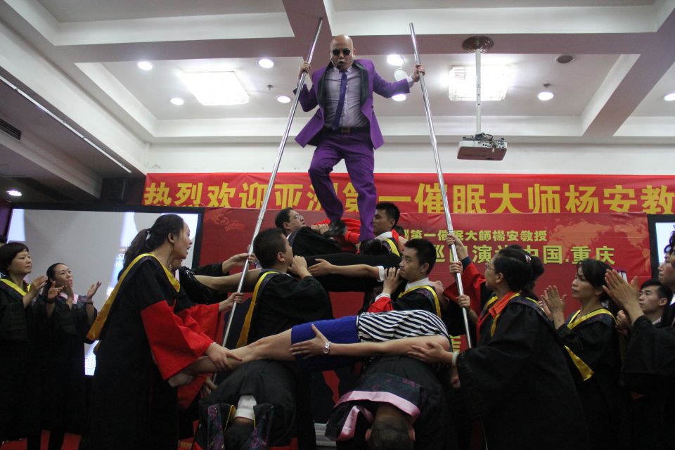亚洲第一催眠大师杨安教授的世界顶级催眠秀,世界首创三层阶梯型催眠秀变钢板,以及瞬间变钢板催眠秀,不仅让台下的观众都看的惊呆了,就连台上的催眠体验者都不敢相信自己真的可以在催眠状态下爆发出如此大的潜能。大师一出场,只是一个简单的动作,就瞬间让一个弱小的女孩变成了钢板,悬空的被几个彪形大汉扛在肩膀上,呈三层阶梯型状,杨安教授从上面一级一级的跳下。