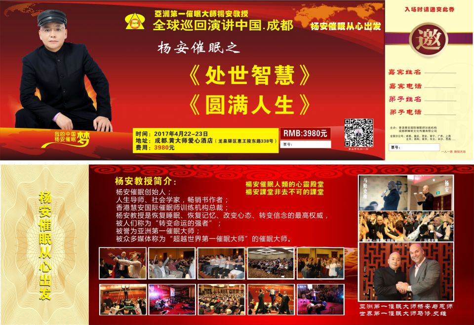 2017年4月22-23日,亚洲第一催眠大师杨安将莅临成都公益演讲